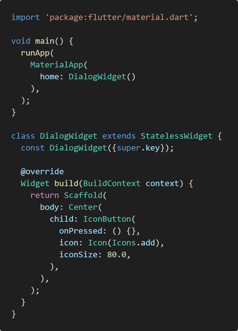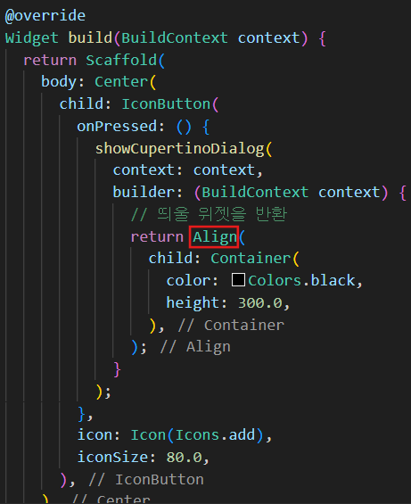 - 이 컨테이너가 Dialog 상자 내부에 표시될 위젯이다. 즉, 사용자가 버튼을 눌렀을 때 검은색 배경의 Dialog 상자가 화면에 나타난다.
