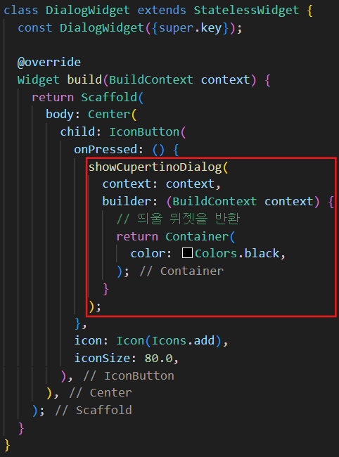 아이콘을 누르면 showCupertinoDialog 함수가 호출되도도록 onPressed 콜백 함수안에 넣어준다.