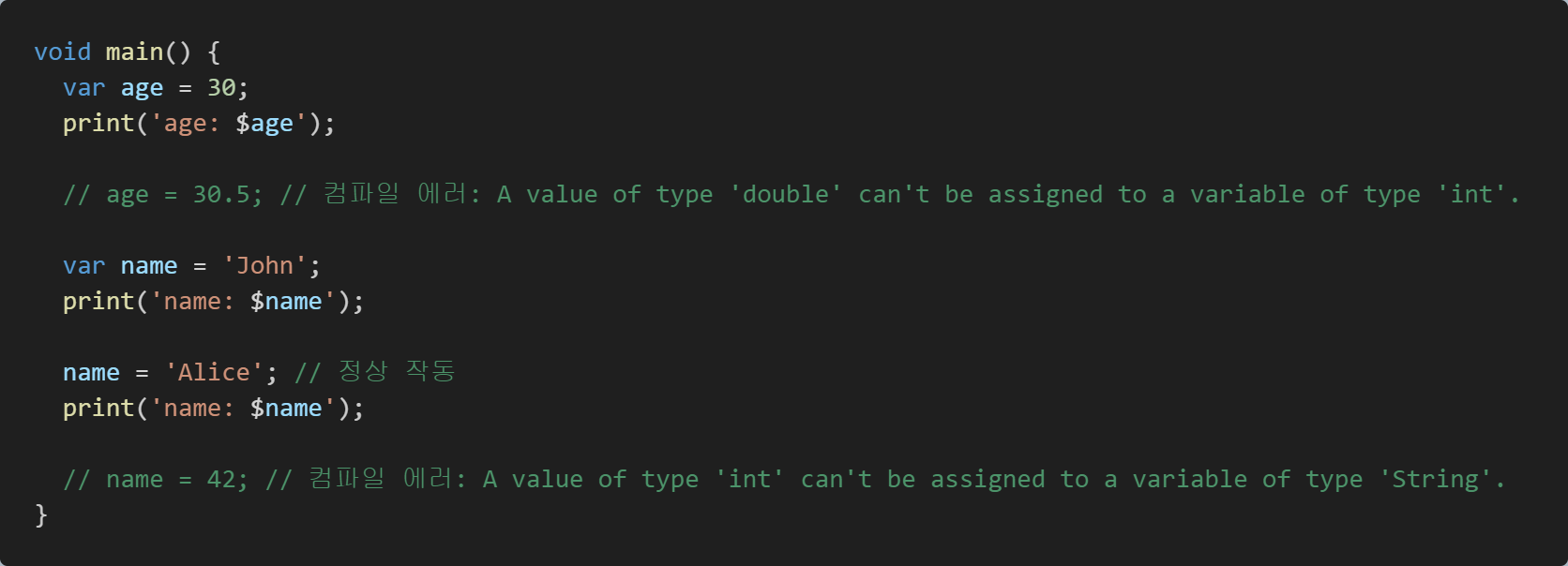 Dart에서는 변수 선언 시 명시적으로 타입을 지정하지 않고도 변수를 선언할 수 있다.