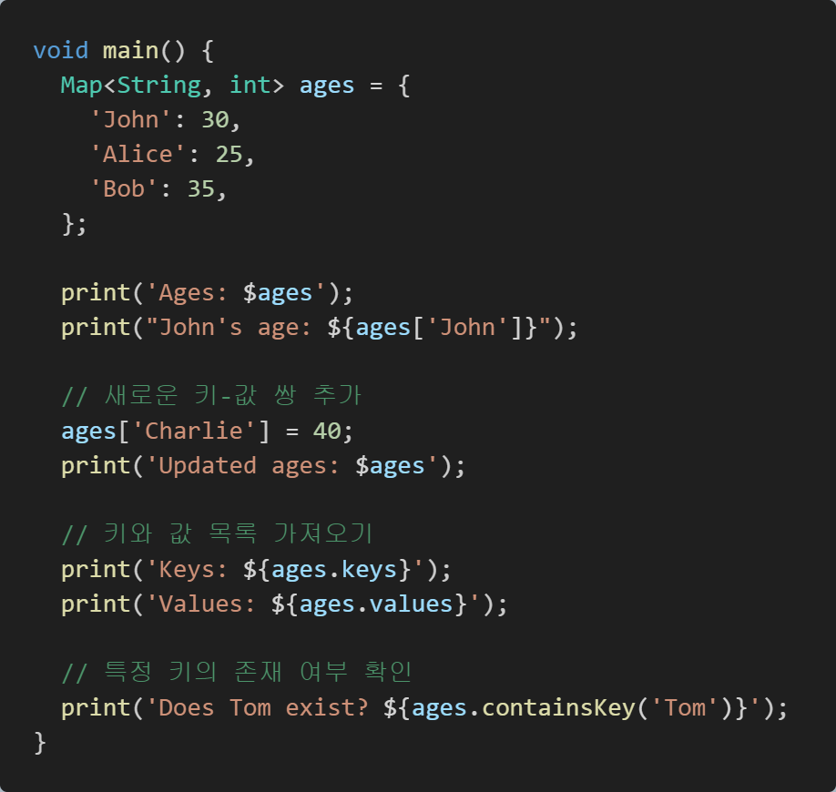 Dart에서는 기본적으로 List, Set, Map 세 가지 컬렉션 타입을 제공한다.