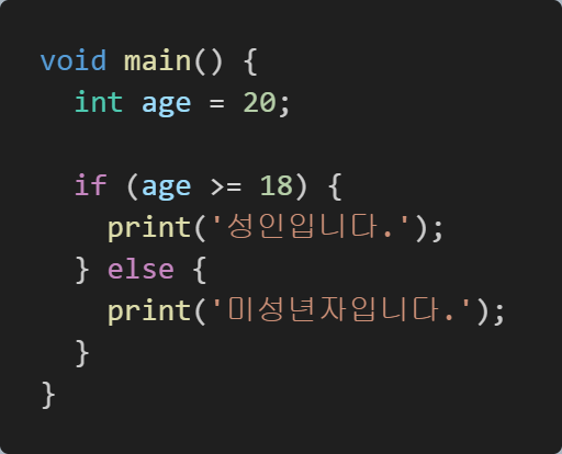 - 블록 사용: 조건문 내부에 여러 줄의 코드가 있을 경우, 중괄호 {} 를 사용하여 블록으로 묶어줘야 한다.