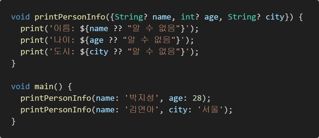 네임드 파라미터는 매개변수의 이름을 명시하여 함수를 호출하는 방식이다.