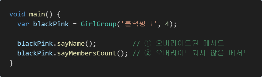 - ① sayName() 메서드: 오버라이드되었으므로 GirlGroup 클래스에서 재정의된 버전이 실행된다.