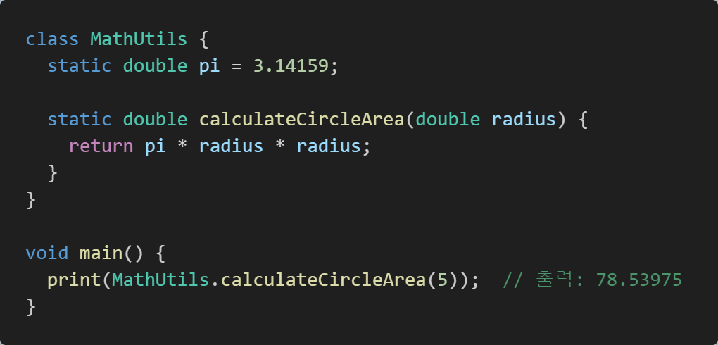 이 예제에서 calculateCircleArea 메서드는 객체를 생성하지 않고도 직접 호출할 수 있다.
