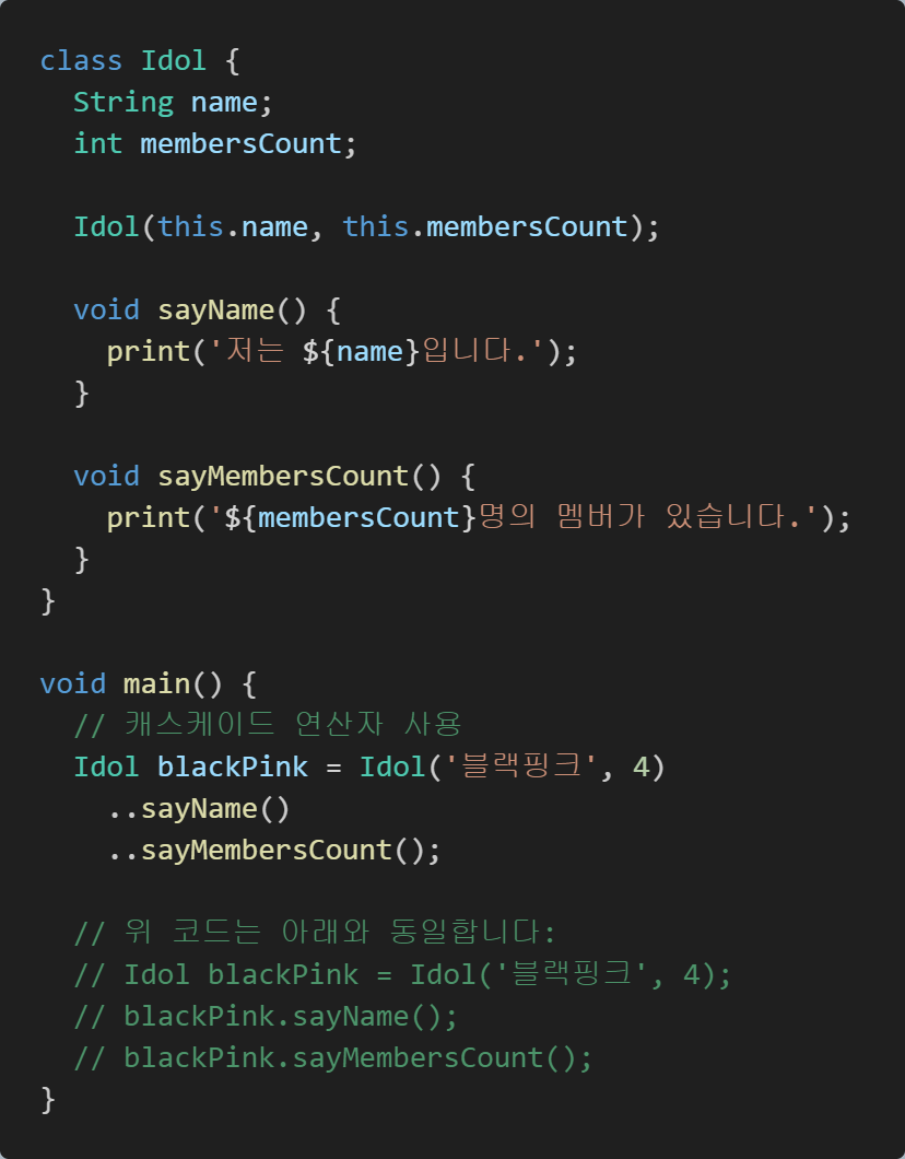 Idol 클래스를 사용하여 캐스케이드 연산자의 사용법을 살펴보겠다: