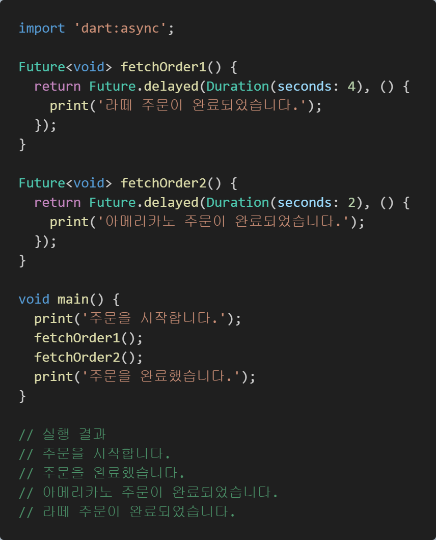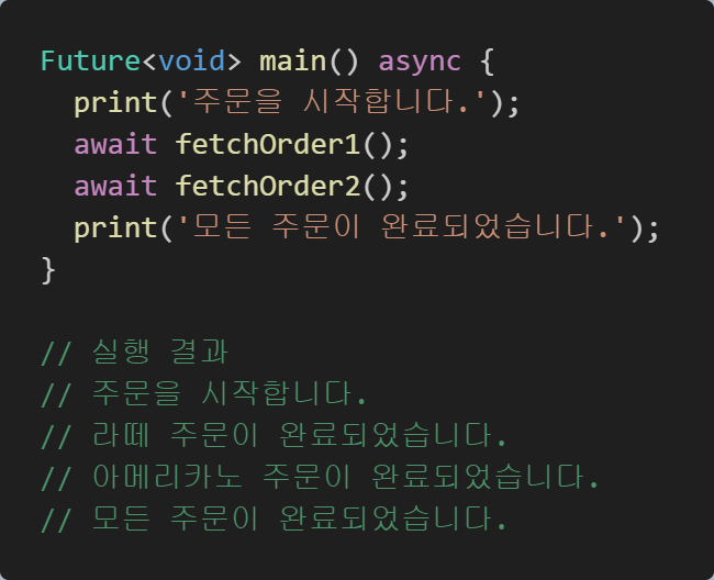 - main() 함수에서 fetchOrder1()과 fetchOrder2()가 순서대로 호출되었지만, 실행 결과는 호출 순서와 다르다.