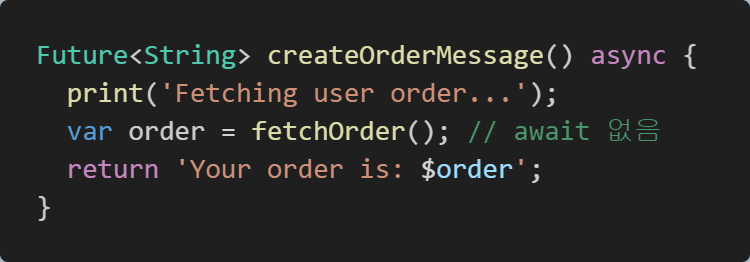 1. await 없이 비동기 함수 사용: await 없이 비동기 함수를 호출하면, 함수는 Future 객체를 즉시 반환한다.