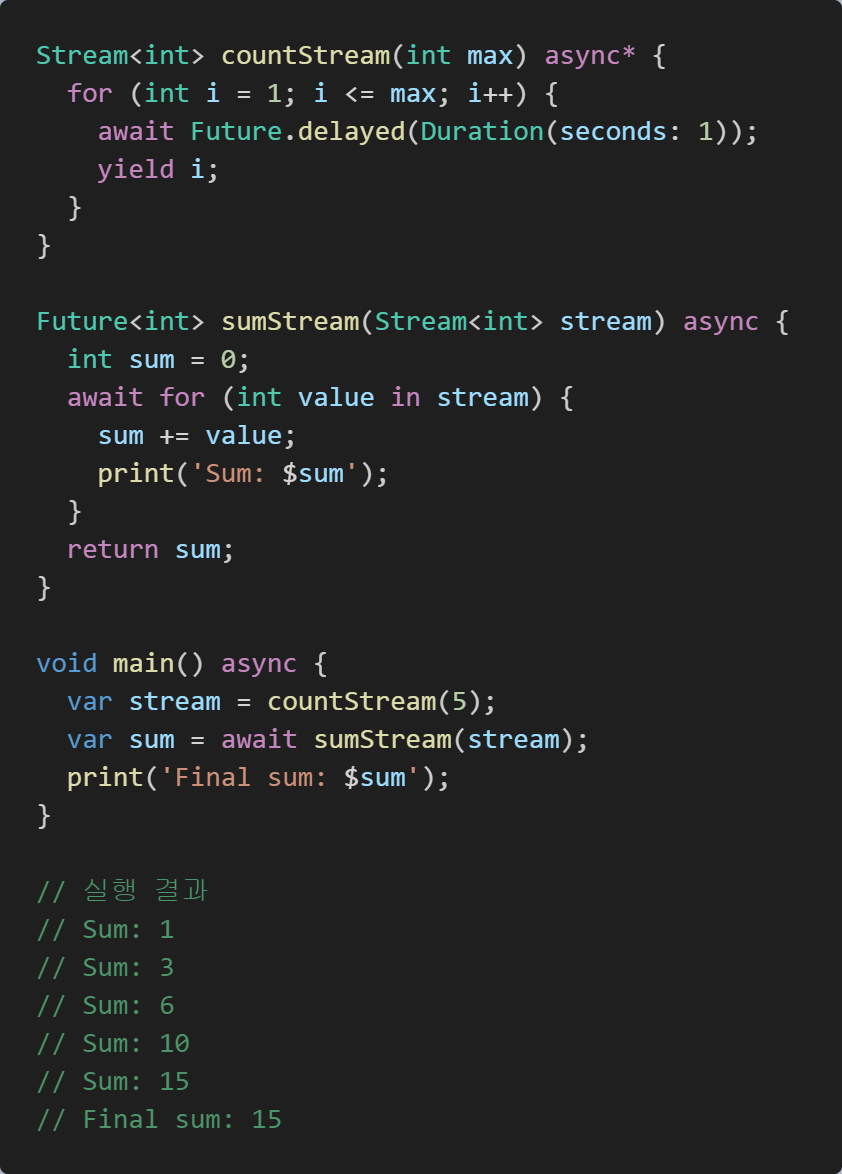 - await for 문을 사용하여 스트림의 값을 순차적으로 처리한다.