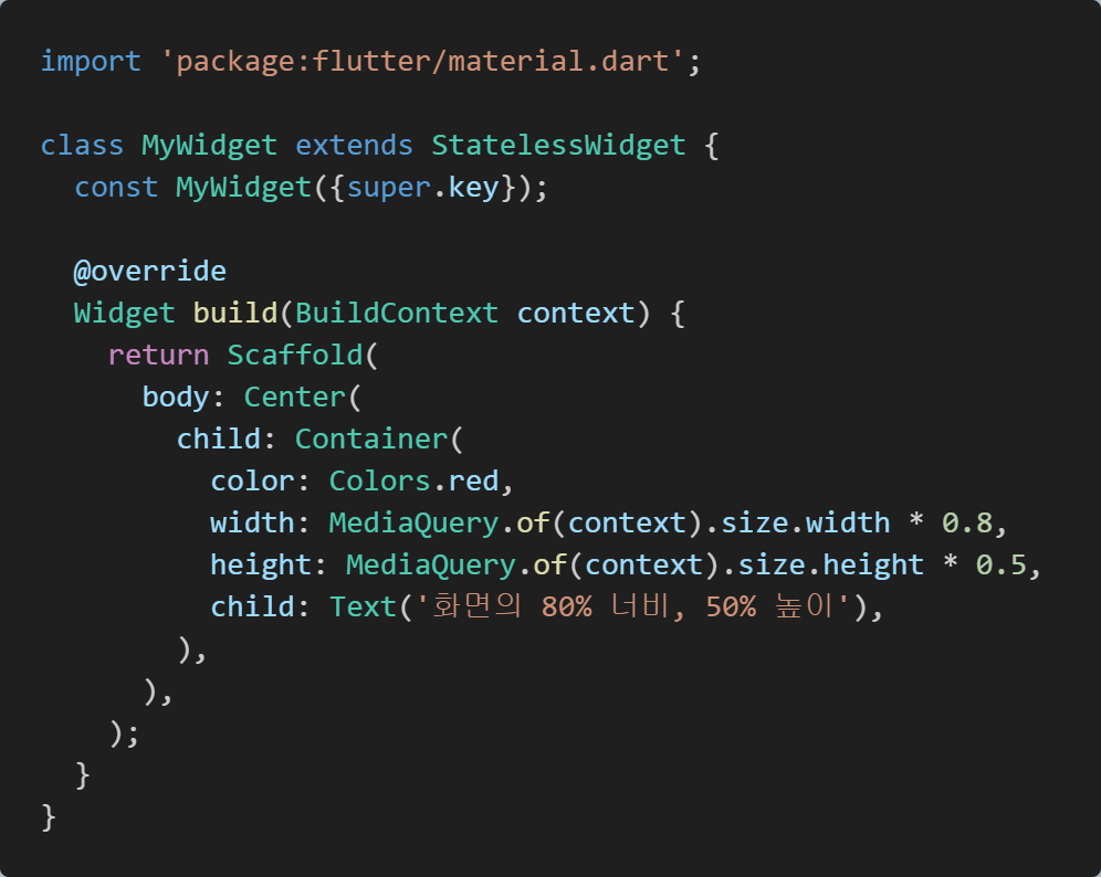 - build 함수에서 받은 context를 MediaQuery.of(context)에 전달함으로써, 현재 위젯의 위치에서 가장 가까운 MediaQuery 정보를 얻을 수 있다.